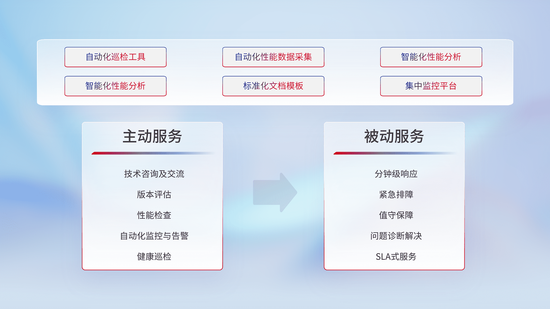 智能化工具和标准化文档,,,,保障服务质量,,提供主动服务(包含技术咨询、、、、版本评估、、、性能检查、、、、自动化监控与告警、、、、健康巡检)和被动服务包含(分钟级响应、、、、紧急排障、、值守保障、、问题诊断解决、、、SLA服务)。。。